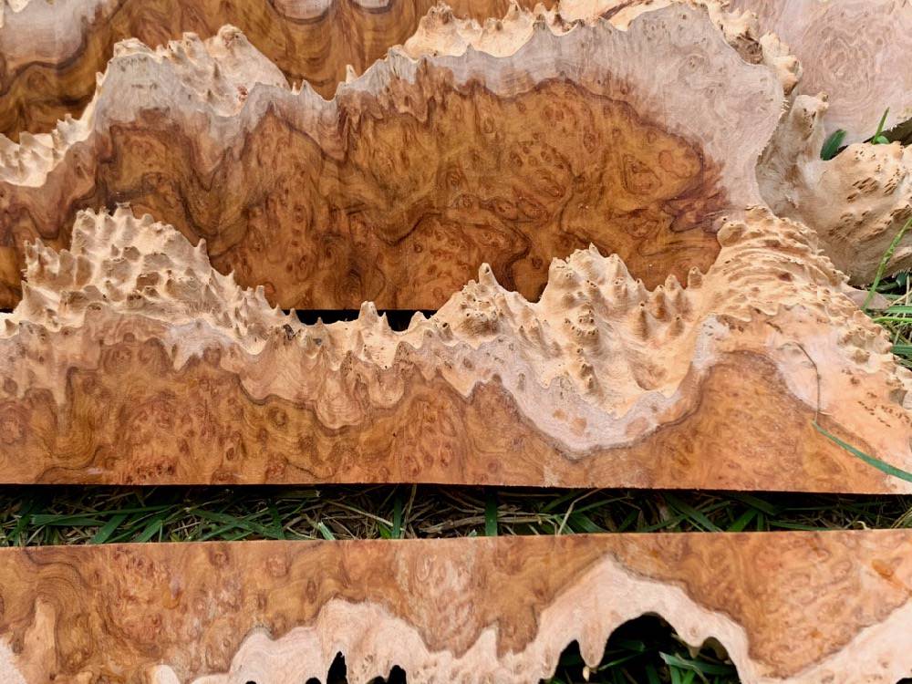 Hybrid casting has become ubiquitous. But the coolness of the exterior spikes aside, let's face it, everyone wants to see what's "inside" to get some sense of the color and figure. I get it. So I trim and strip cut certain burls, whose shape or the presence of a cut edge may not make it an ideal candidate for turning, but great for casting (with the added benefit of standard solid burl blanks and a lower price point than dimensional stock). I typically cut in widths of 1", 1-5/8" or 1-3/4", but if there's a burl you'd like cut in a different width(s), I'd be happy to do so. There is no charge for doing so, providing you purchase the entire burl. Alternatively, take a look at the Cutoffs page, which, depending on what you're looking to do and the cutoff lot of interest, may be a more cost effective option.